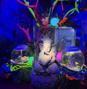 蓄光のガラス植物「ウカルクパ」が光る幻想的な森。